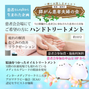 「膵がん患者夫婦の会」では、当日患者会にご参加の患者様を対象に ハンドトリートメント(約10分) を行います。